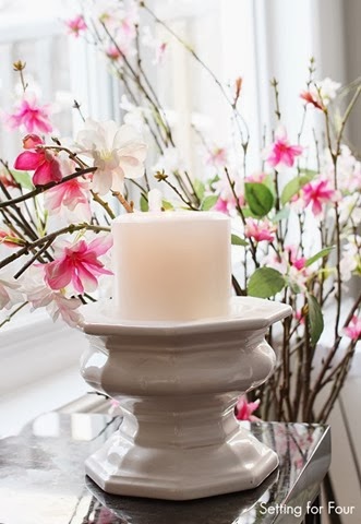I added my large DIY glossy white vase filled with faux cherry blossom branches behind my chair for a pop of pink: