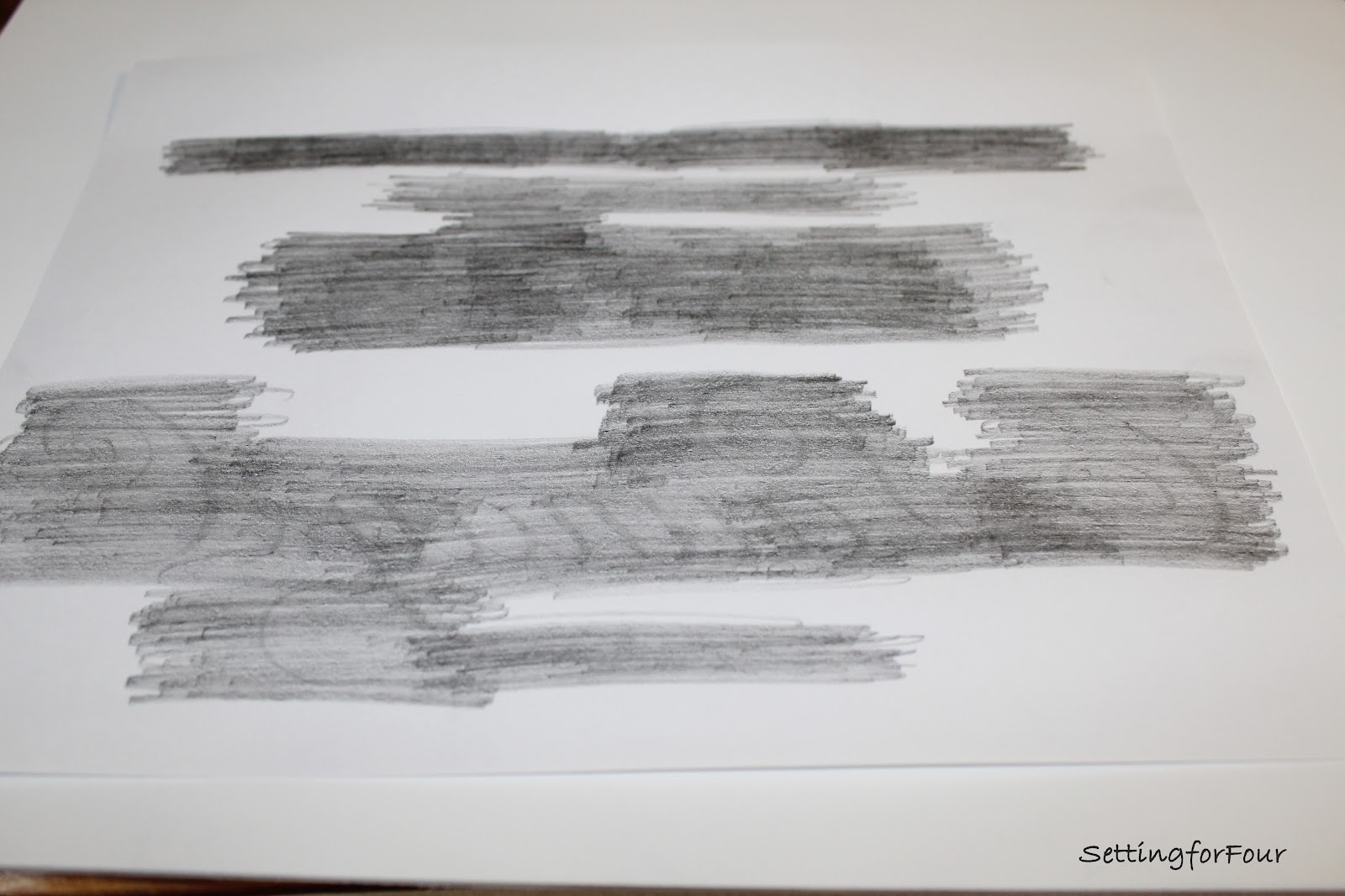 – On the reverse side of each photocopied printable, (the blank side), shade the area of the graphic with pencil. This will create a transfer of the graphic. You can see in this pic where I shaded the area where the words and lines are: