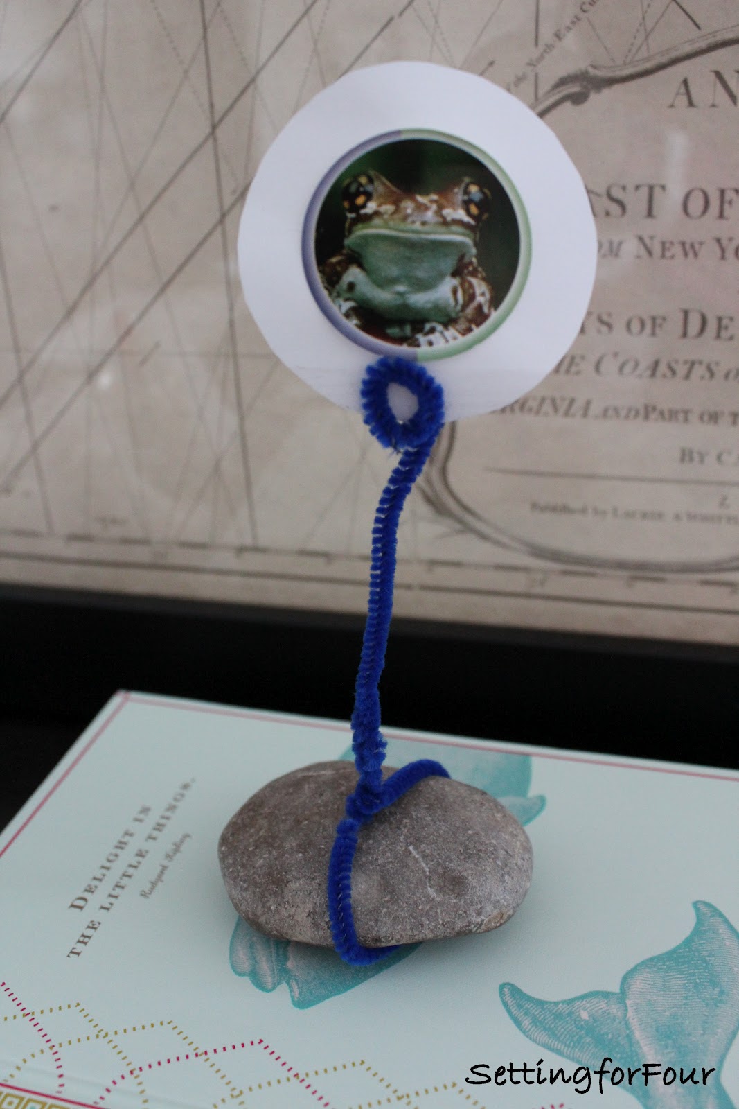 – Wrap one end of pipecleaner around rock once and twist to secure, leaving the other end of the pipe cleaner sticking straight up.