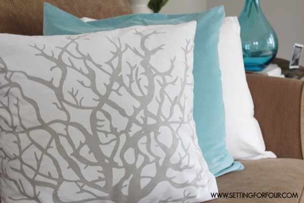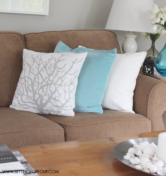The beauty of adding textiles to a room is that they aren’t a permanent change…..you can mix up other textiles you already own for brand new looks! Here I added two of my favorite pillows: these tan and white pillow cases featuring pictures of coral (I bought these from IKEA years and years ago!) I also added a teal blue vase of tulips for another pop of blue. When I tire of these items I can move them to other rooms- easy decorating!